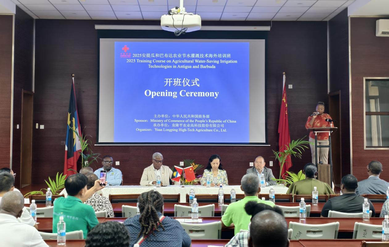 2025年10月16日,由中国商务部主办、袁隆平农业高科技股份有限公司承办的“农业节水灌溉技术海外培训班”在安提瓜和巴布达圣约翰顺利开班。安巴农业、土地、渔业和蓝色经济部大使迪恩·乔纳斯,安巴农业部常秘沃尔特·克里斯托弗,中国驻安巴使馆经商事务负责人常云和隆平高科国际培训学院副院长翁永出席开班式并致辞。中国农业领域专家和来自安巴农业部门的官员、技术人员和参训学员等百余人与会。