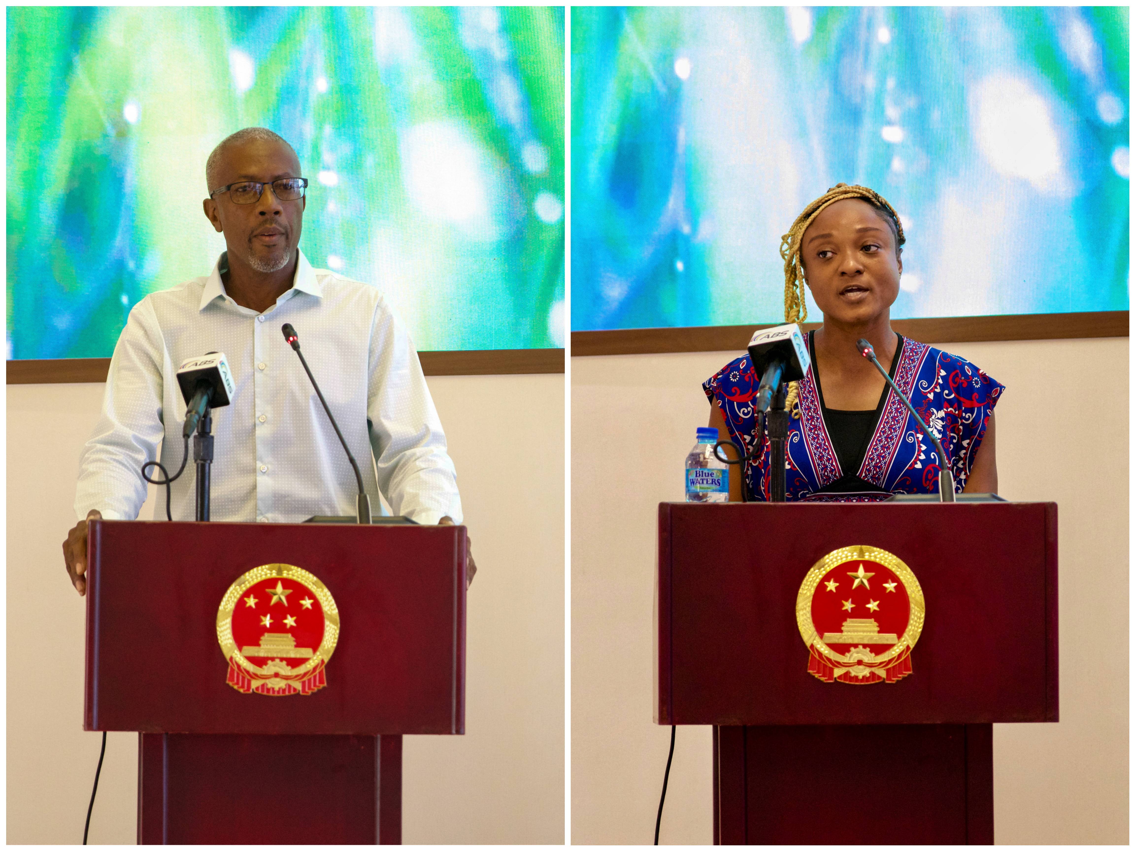 农户代表戈姆斯、拉尔夫分别作交流分享。戈姆斯曾于2019年赴华参加农业技术培训,至今对这段宝贵经历印象深刻,衷心感谢中方为安巴提供的实实在在的帮助,并期待再次前往中国进行交流学习。拉尔夫感谢中方专家提供的多种蔬菜种苗,在专家组的指导下已完成了种苗移栽,期待在不久的将来迎来收获。